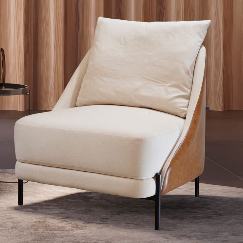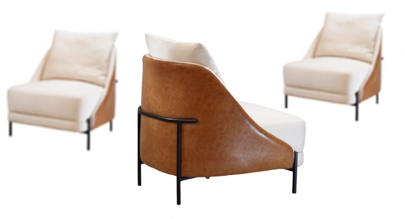 Poltrona com pés de metal e composê de couro ecológico e linho cru.